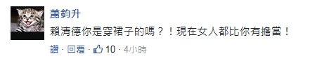 不料此话一出,即遭网友打脸,“天天鞭尸马英九,那选你们上台干嘛,找借口谁都会,下次选头猪好了!”还有人对赖清德的性别持怀疑态度,“‘赖院长’难道穿的是裙子?话说现在的女人都比你有担当……”“喜欢打太极?那年底就让你们下台!”