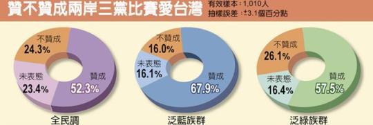 赞不赞成两岸三党比赛爱台湾民调。(图片来源:台湾《中时电子报》) 中国台湾网7月3日讯 台湾旺旺中时媒体集团发布的最新民调显示,有高达52.3%的民众赞成国民党、民进党、共产党三党一起来比赛爱台湾,反对的只有24.3%。交叉分析显示,不分泛蓝或泛绿,赞成的比例都超过一半,分别达到67.9%以及57.5%。台湾《中国时报》报道指出,爱台湾就是要让台湾人日子过得更好! 报道指出,面对台湾内部长期陷入蓝绿恶斗和对立内耗的局面,台湾舆论传出“无色觉醒”的呼声,并反思是否该有“第三种选择”,应该让国民党、民进党和共产党一起来比赛,由台湾老百姓做评审,看谁最爱台湾。 尽管这样的声音刚刚才冒出头,但根据旺旺中时媒体集团所发布的民调,有过半的受访者表示赞成,且比例已经高达52.3%,表示反对者则只有24.3%,未表态的比例也有23.4%,反映选民对目前的政治情势的失望。 交叉分析发现,不分性别赞成的比例都过半。男女分别是51.9%、52.8%。在年龄层部分,除了40到49岁只有47.2%表示赞成,其他各年龄层赞成的比例都过半。就政党倾向方面,自认是泛蓝以及泛绿的支持者,各有67.9%、57.5%表示赞成,显示不分蓝绿都同意有更多的选择,甚至某种程度也展现对蓝绿恶斗的不满。 报道称,观察民调结果,不分年龄、政党、地区都不反对让共产党加入爱台湾的赛局,显示台湾人民不愿被政党绑架,厌恶只有颜色、不问是非。除了寻找新的出路,对蓝绿有恨铁不成钢的味道。 此次民调是在7月1至2日,以电话后2码计算机随机抽样,人员电话访问的方式取得,有效样本1010人,抽样误差为95%信心水平以下,正负3.1个百分点。